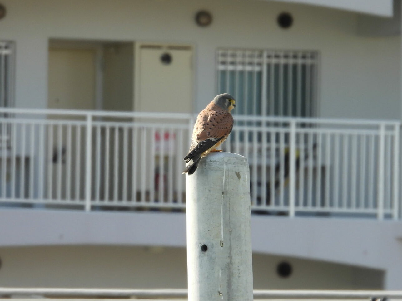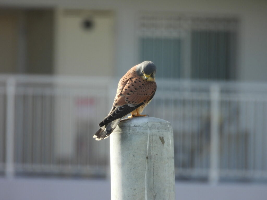 いろんなカモたちを観察して大満足で帰宅しようとしたそのとき、電柱のてっぺんに止まるチョウゲンボウを発見!